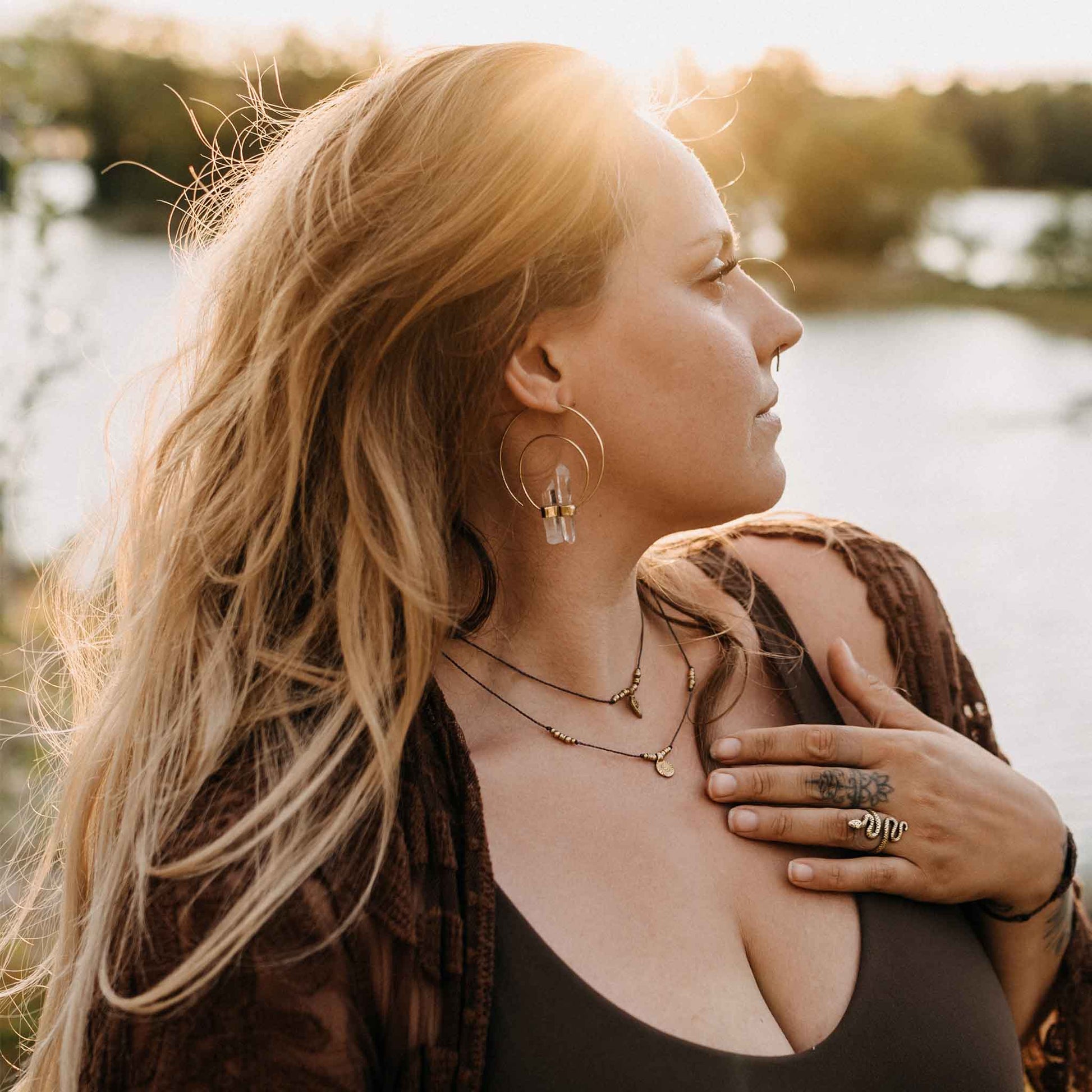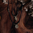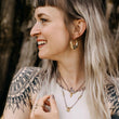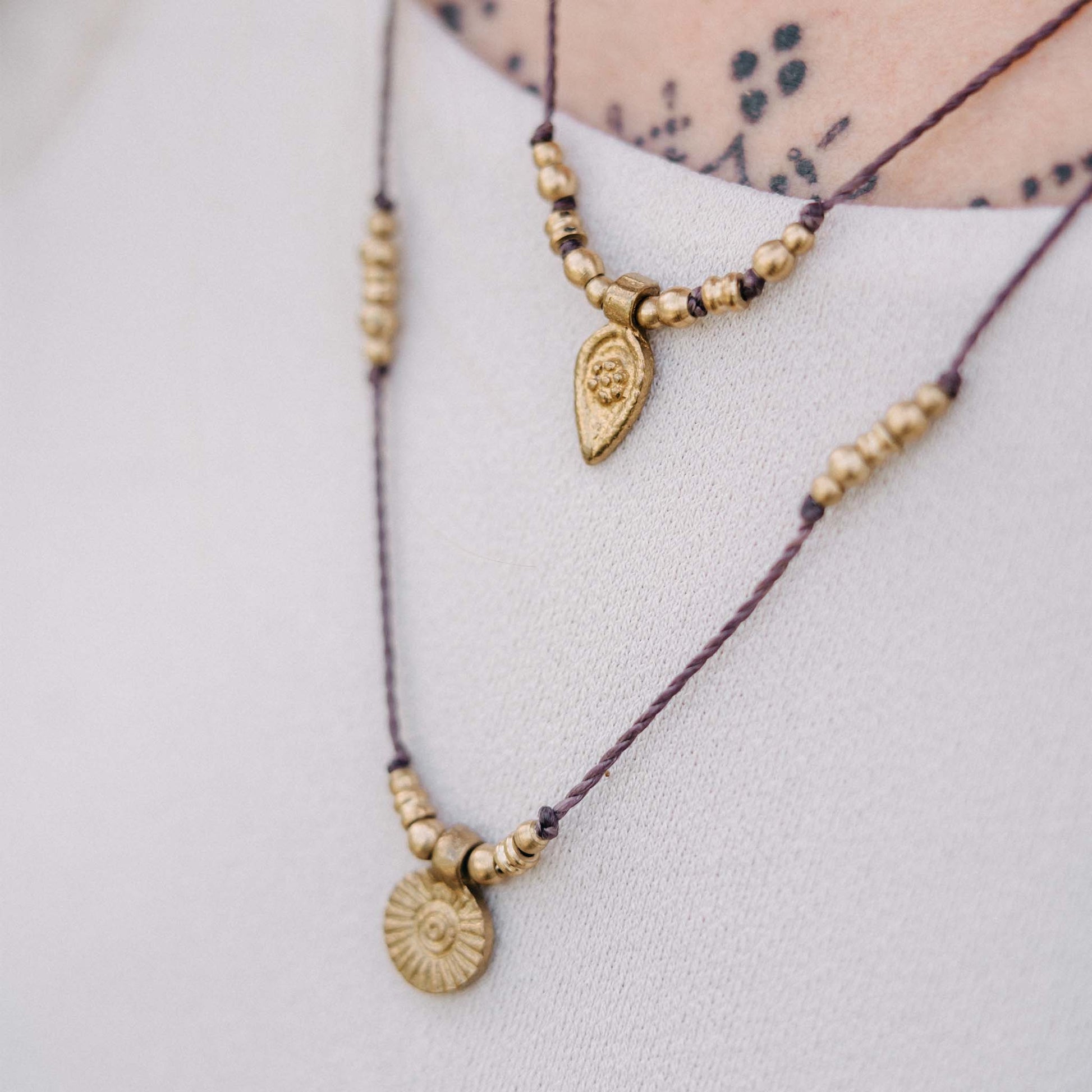 Handgeknüpfte Makramee Halskette von einer reisenden Handwerkerin. Wähle eine der beiden Ketten oder kombiniere sie miteinder. Du kannst sie durch einen verstellbaren Verschluss auf verschiedenen Höhen anbringen. Die Halskette Gede mit einem Sonnen-Anhänger und die Halskette Anom mit einem spitz zulaufenden Anhänger. Diese einzigartigen Ketten bringen eine filigrane Ästhetik mit sich und umhüllen dich mit dem Zauber von handgemachten Schmuckstücken.