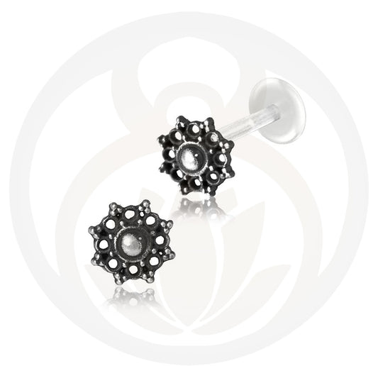 Labret Piercing mit einem Schraubgewinde und einem Mandala welches einen Onyx hält. Du kannst das...