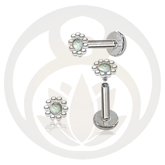 Labret Piercing mit einem Schraubgewinde und einem Mandala welches einen Jade hält. Du kannst das...