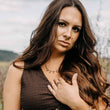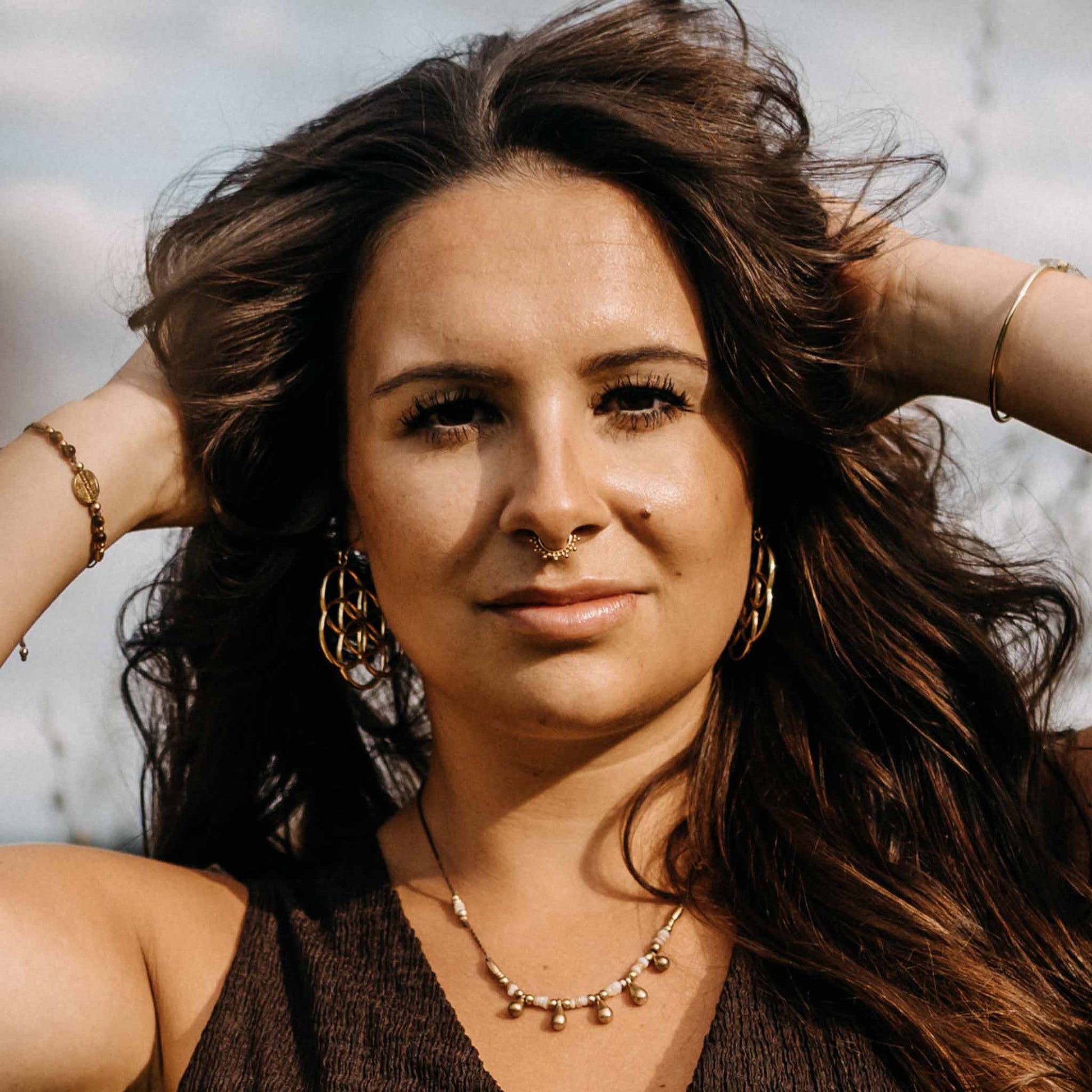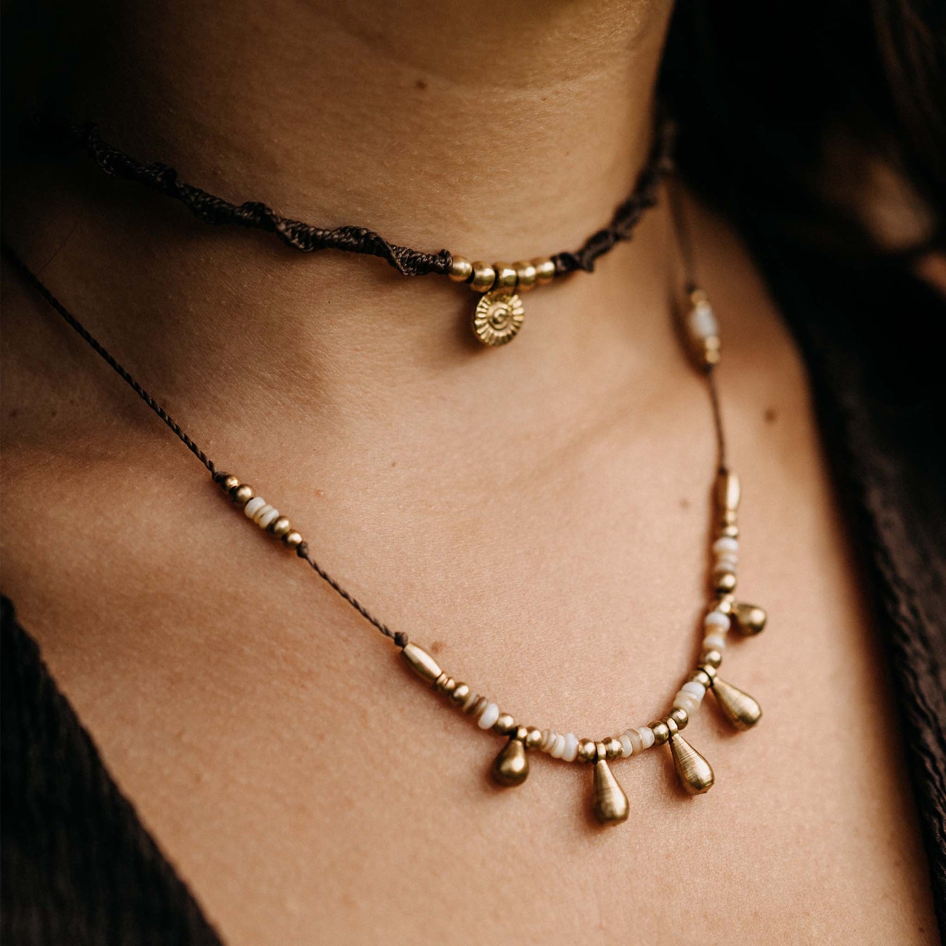 Halskette mit schmalen Perlmutt-Perlem und goldenen Messingtropfen, handgemacht von der Shopinhaberin Lisa. Du kannst sie durch einen verstellbaren Verschluss auf verschiedenen Höhen anbringen. Auf dem letzten Bild siehst du die Kombination mit der Halskette Rainha die du auch im Shop findest. Diese einzigartigen Ketten bringen eine filigrane Boho-Ästhetik mit sich und umhüllen dich mit dem Zauber von handgemachten Schmuckstücken.