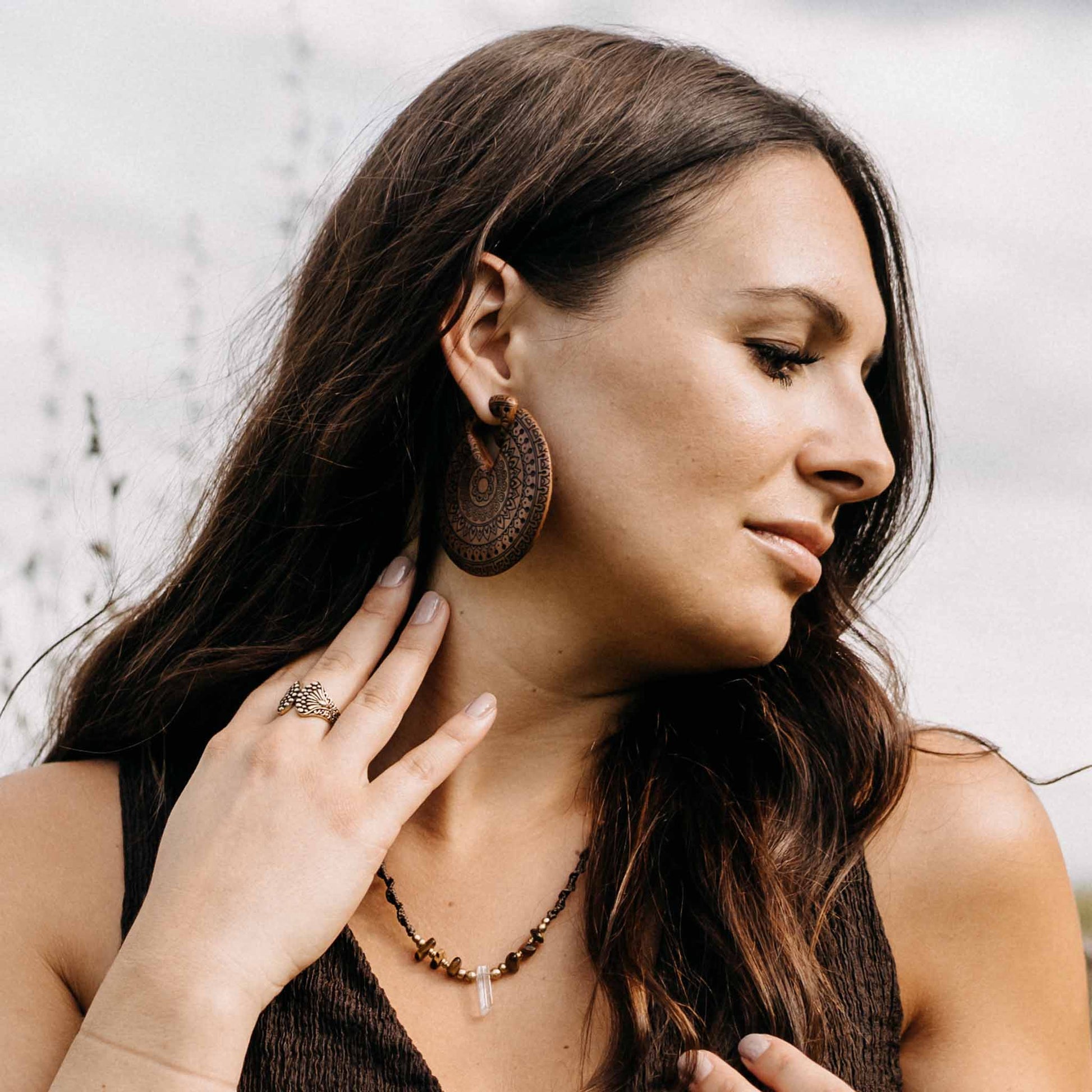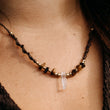Halskette mit einem zarten Bergkristall und Tigerauge-Splittern, handgemacht von der Shopinhaberin Lisa. Du kannst sie durch einen verstellbaren Verschluss auf verschiedenen Höhen anbringen. Diese einzigartigen Ketten bringen eine filigrane Boho-Ästhetik mit sich und umhüllen dich mit dem Zauber von handgemachten Schmuckstücken.
