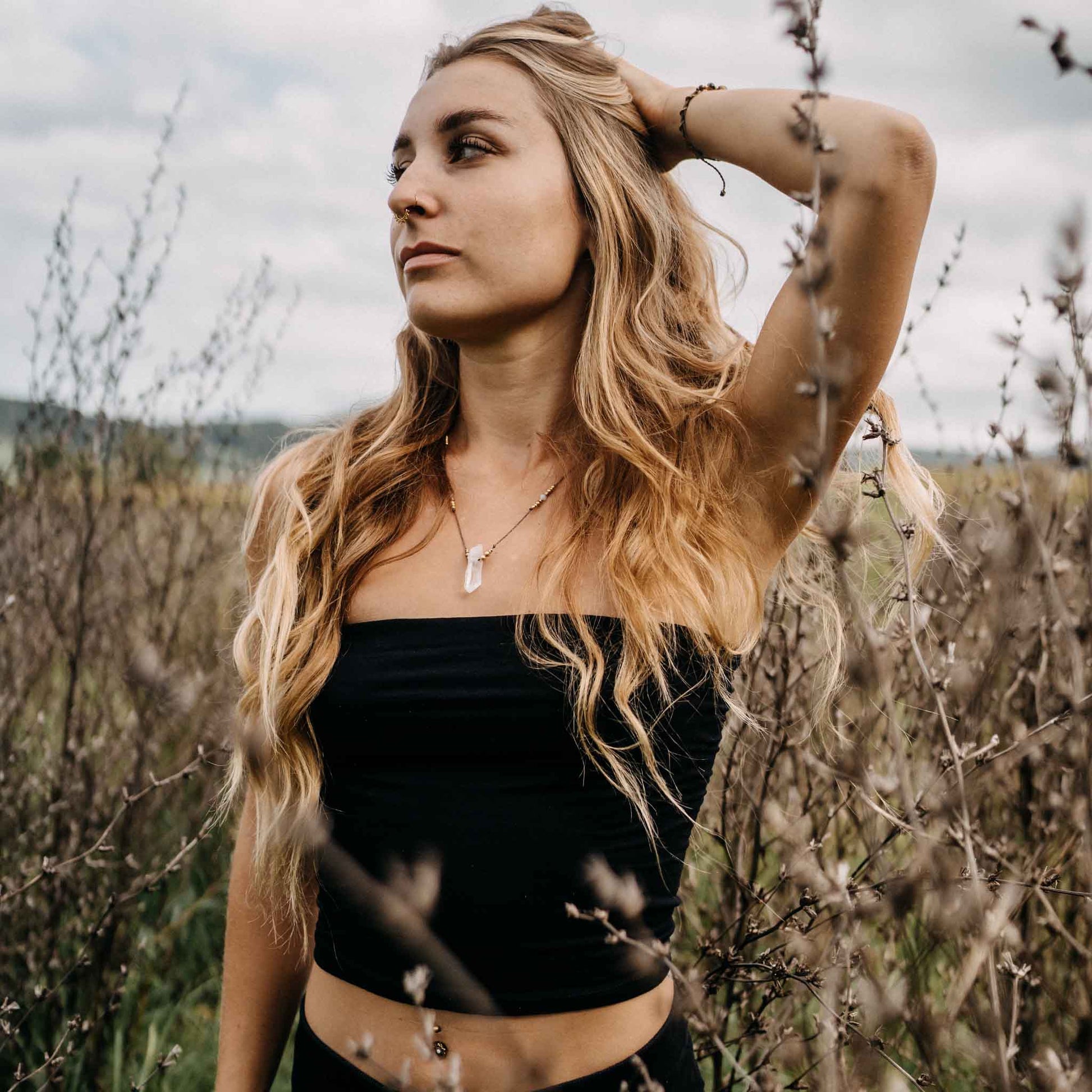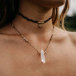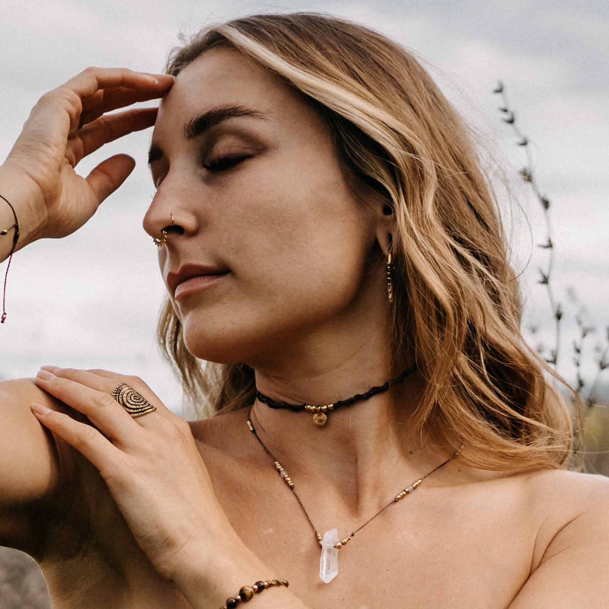 Statement Halskette mit einem präsenten Bergkristall und Messinganhängern, handgemacht von der Shopinhaberin Lisa. Du kannst sie durch einen verstellbaren Verschluss auf verschiedenen Höhen anbringen. Diese einzigartigen Ketten bringen eine filigrane Ästhetik mit sich und umhüllen dich mit dem Zauber von handgemachten Schmuckstücken. Auf den letzten drei Bildern ist die Halskette Rainha zu sehen, die gibt es auch im Shop.