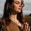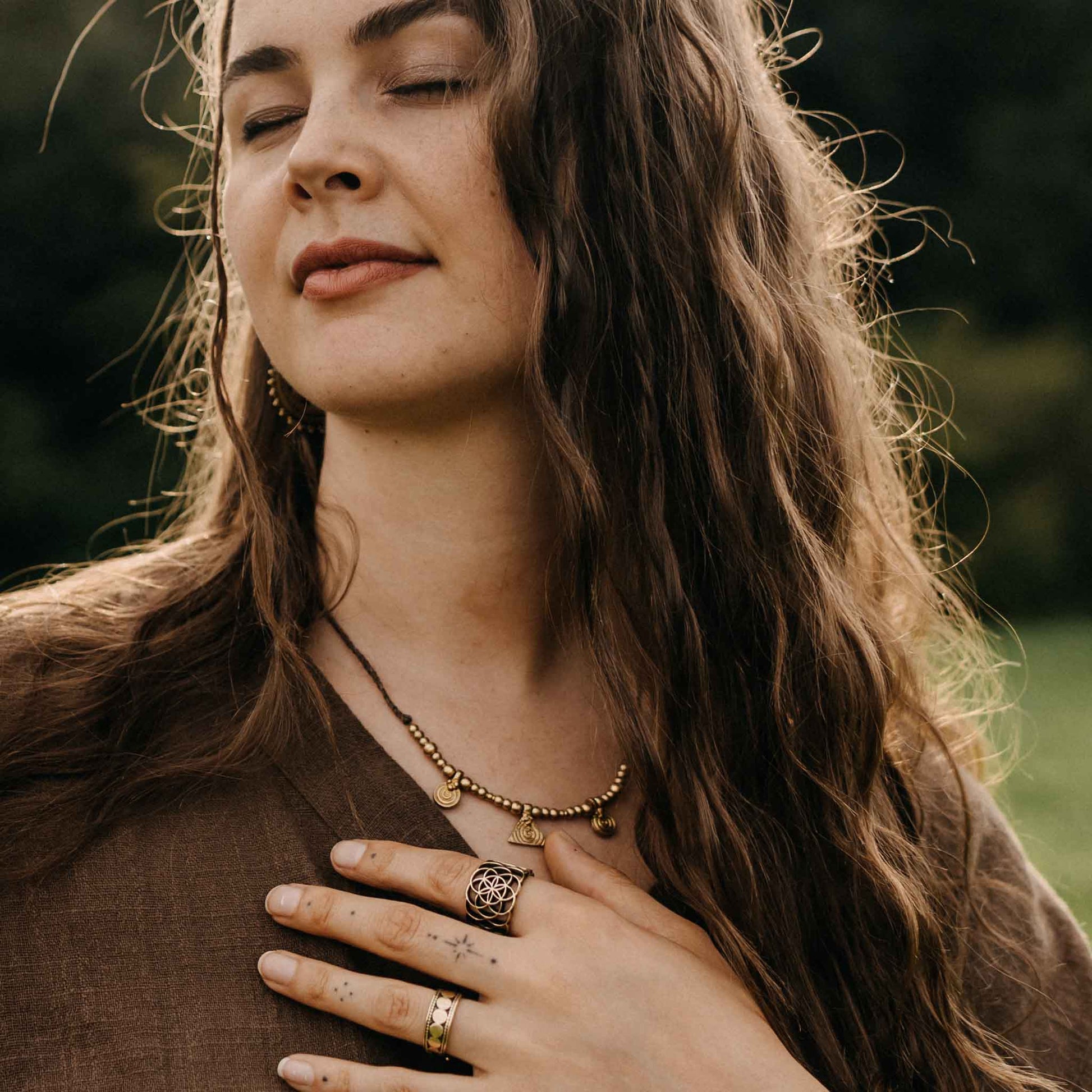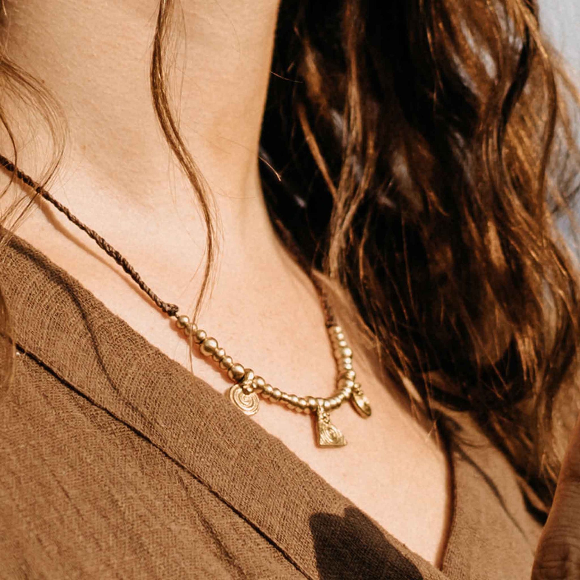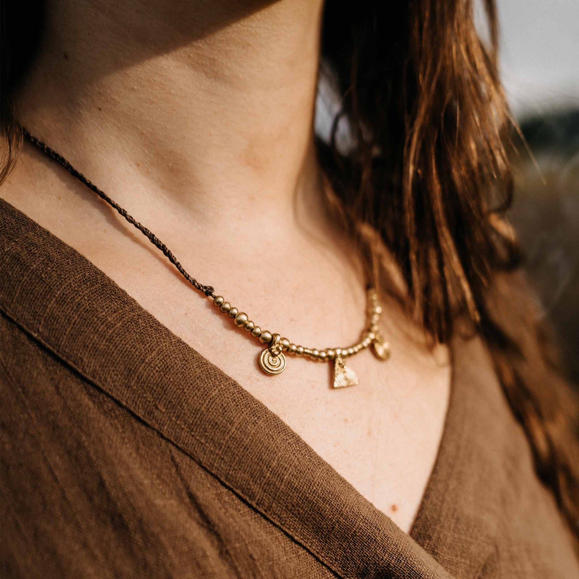 Halskette mit Messinganhängern, handgemacht von der Shopinhaberin Lisa. Du kannst sie durch einen verstellbaren Verschluss auf verschiedenen Höhen anbringen. Diese einzigartigen Ketten bringen eine filigrane Boho-Ästhetik mit sich und umhüllen dich mit dem Zauber von handgemachten Schmuckstücken.