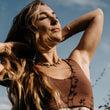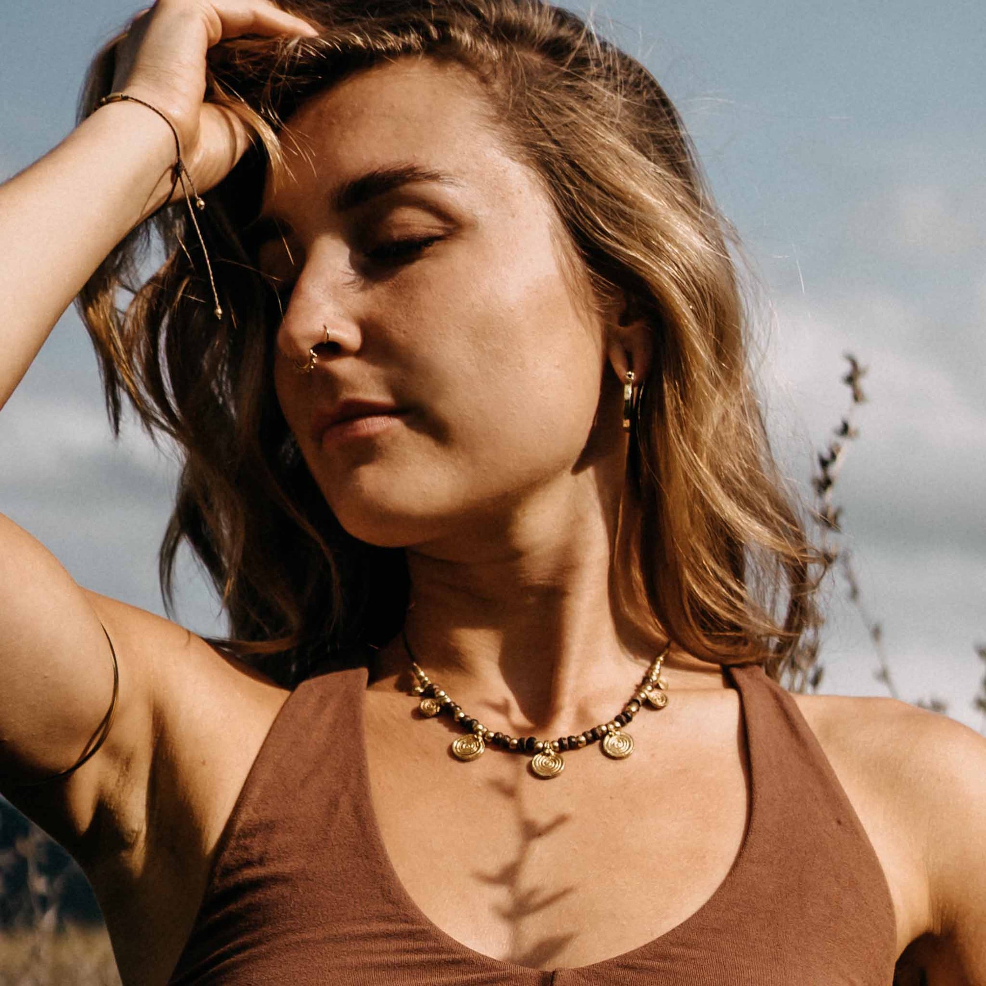 Statement Halskette mit Holzperlen aus Kokosschale und Messinganhängern, handgemacht von der Shopinhaberin Lisa. Du kannst sie durch einen verstellbaren Verschluss auf verschiedenen Höhen anbringen. Diese einzigartigen Ketten bringen eine filigrane Ästhetik mit sich und umhüllen dich mit dem Zauber von handgemachten Schmuckstücken.