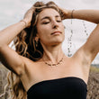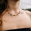 Filigrane Halskette mit braunen Muschelperlen und Sonnen-Anhängern, handgemacht von der Shopinhaberin Lisa. Du kannst sie durch einen verstellbaren Verschluss auf verschiedenen Höhen anbringen. Diese einzigartigen Ketten bringen eine filigrane Ästhetik mit sich und umhüllen dich mit dem Zauber von handgemachten Schmuckstücken.