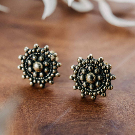 Handgefertigte kleine Ohrstecker mit der Blume des Lebens, dem heiligen Mandala, dem orientalischen Mandala, dem goldenen Rad, dem Baum des Lebens und Heilsteinen wie Türkis und Onyx. Unsere goldenen Ohrstecker mit Steinen sind besonders einzigartig!
