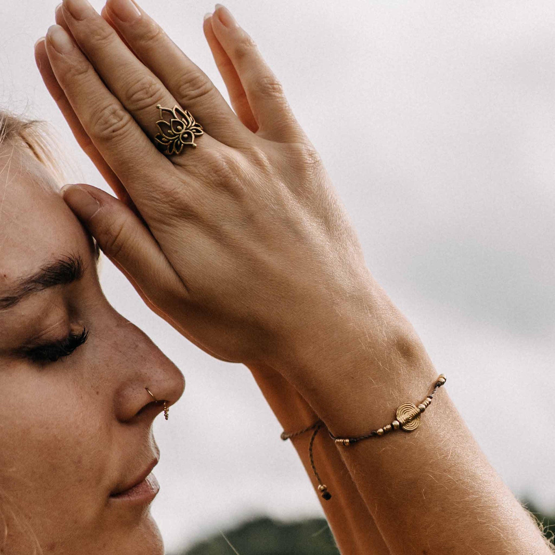 Verstellbarer Fingerring mit einem Lotus. Offener, größenverstellbarer Fingerring. Das Messing lässt sich problemlos in die passende Form biegen.