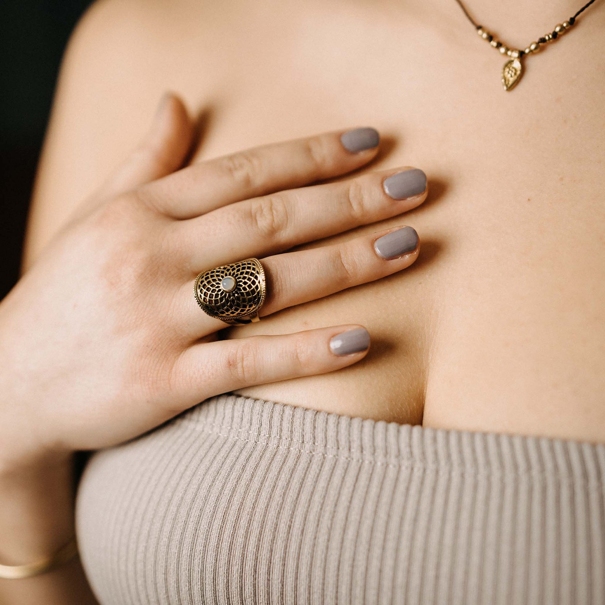 Trage deinen persönlichen Talisman ganz nah bei dir. Filigran gearbeiteter Boho Fingerring mit einem Mandala welches einen Achat hält.