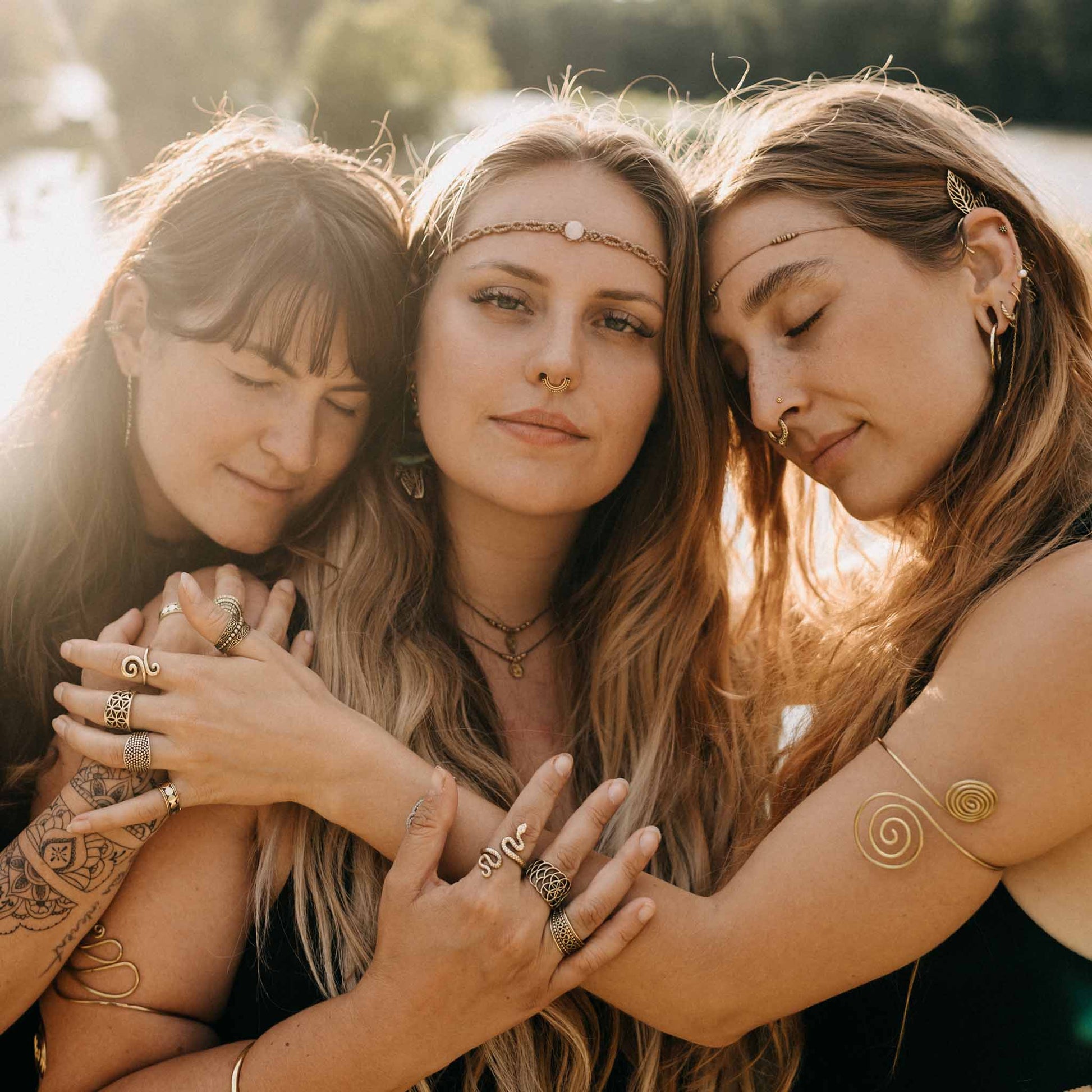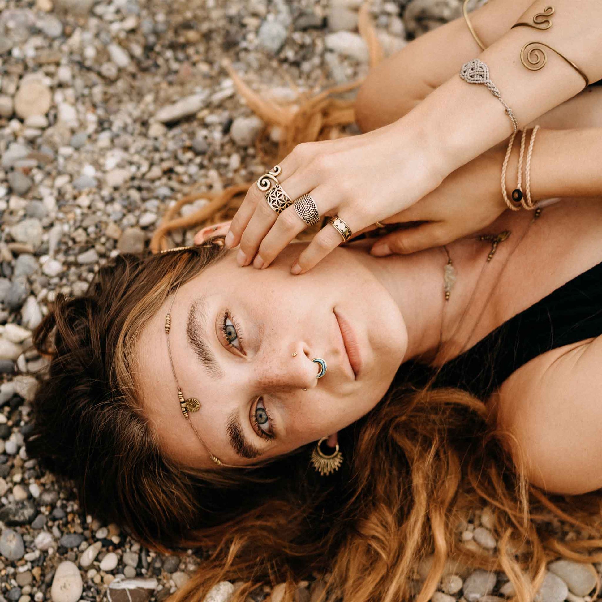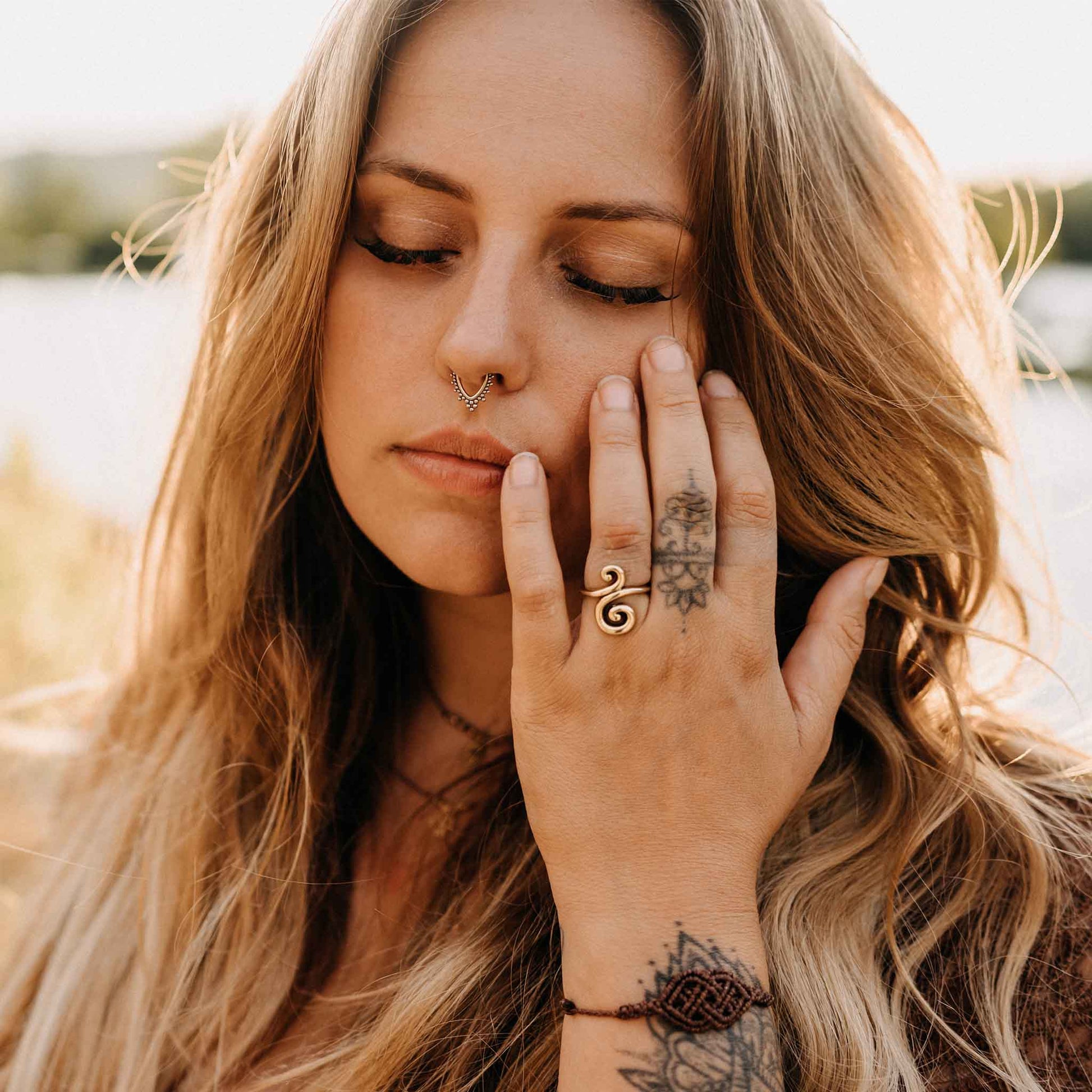 Verzaubere deine Hand mit diesem feenhaften Boho Ring mit zwei großen Spiralen. Trage ihn alleine als Statement-Ring oder kombiniere ihn im Lagenlook mit anderen Hippie Ringen. Der Ring ist größenverstellbar und das Messing lässt sich super gut in die passende Form bringen.