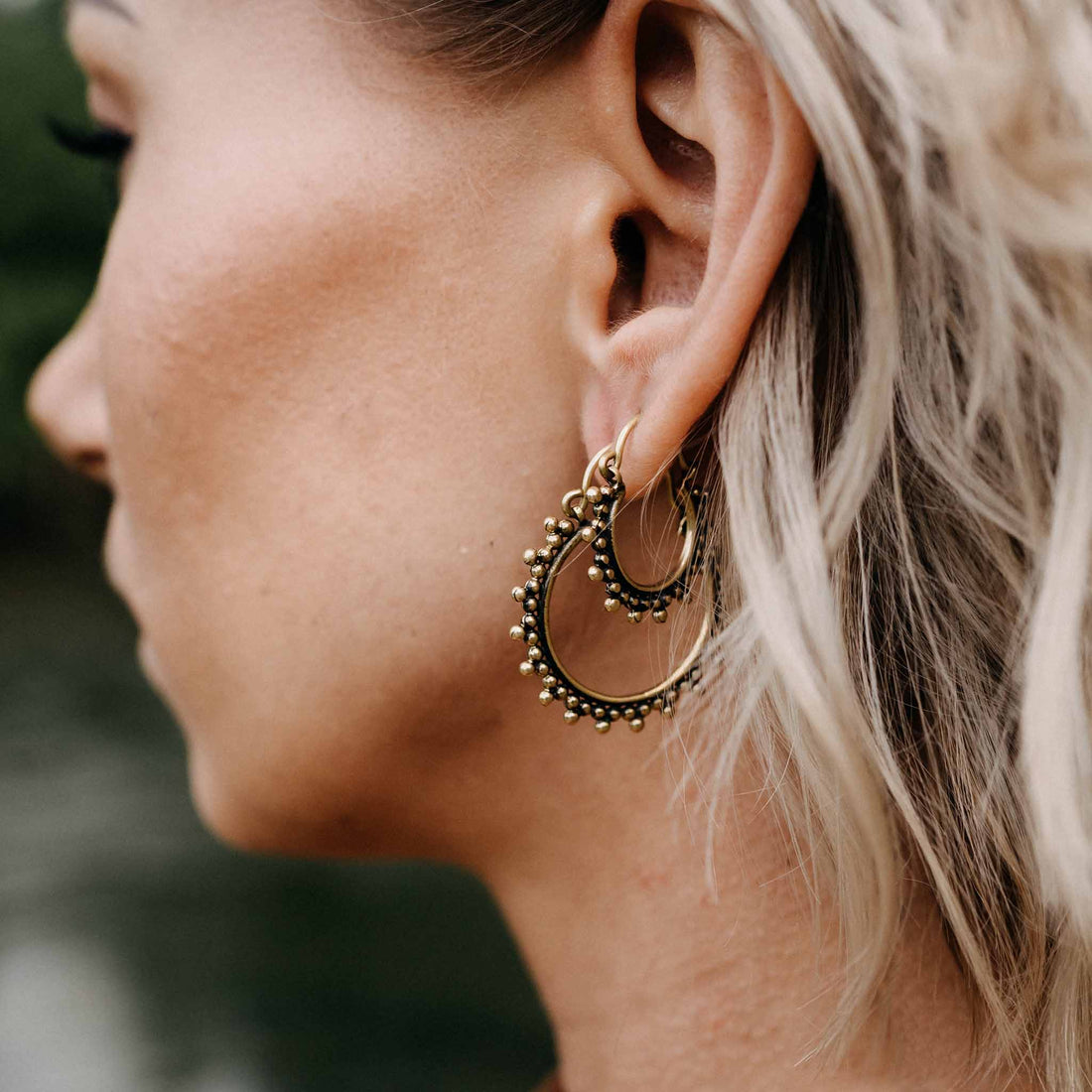 Unsere Messingohrringe gibt es in verschiedenen Formen wie Kreolen, Mandala oder mit Heilsteinen wie dem Bergkristall.