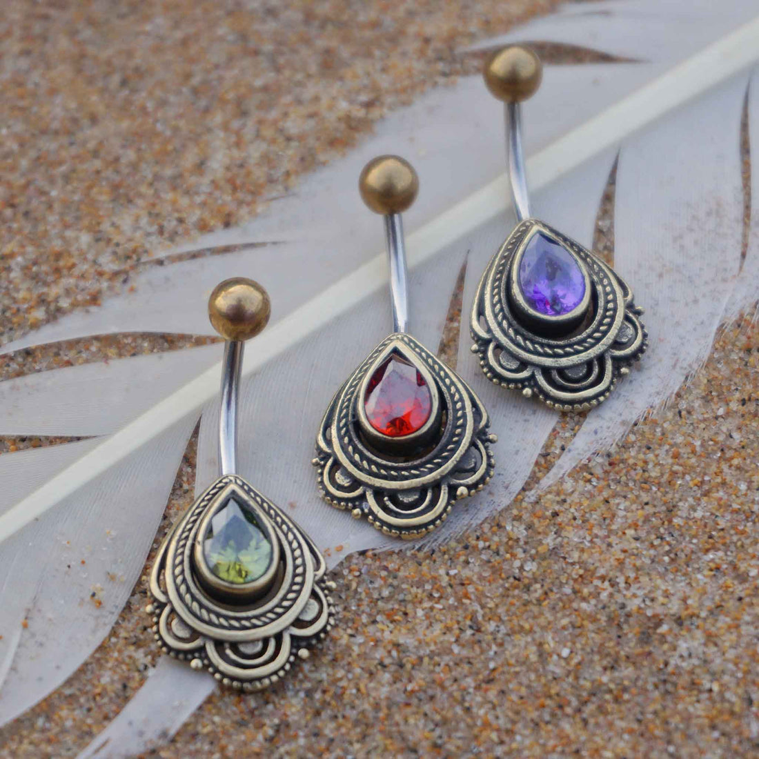 Unique hippie belly button piercing with an incorporated healing stone. The drop-shaped healing stone is...