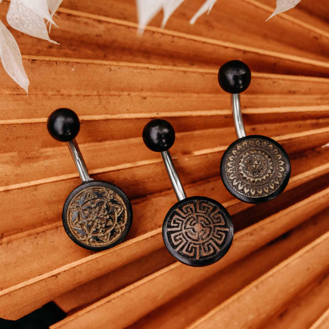 Nature-inspired, wooden navel piercing with finely engraved sacred mandala and patterns. Choose the model that...