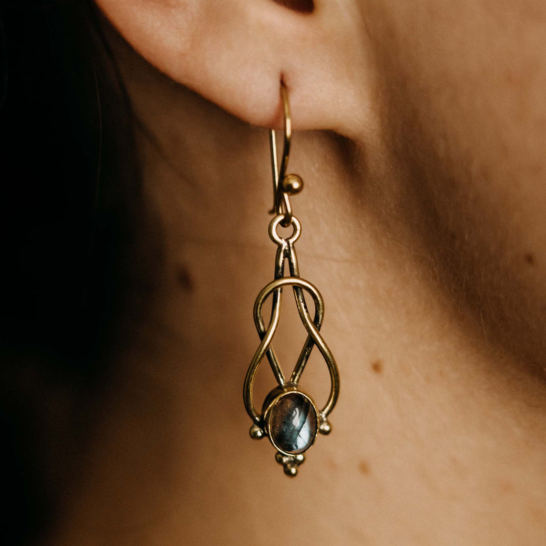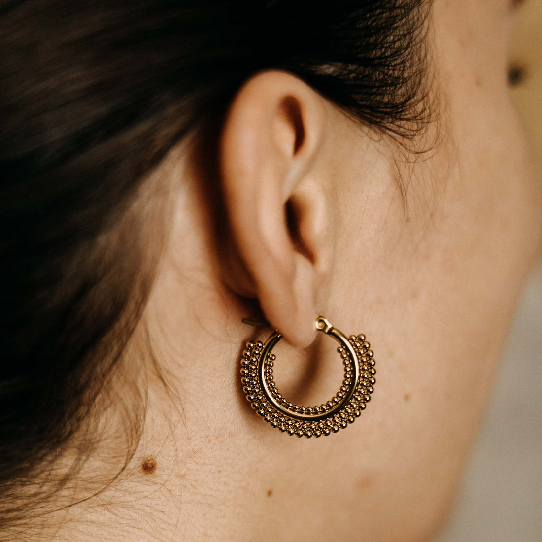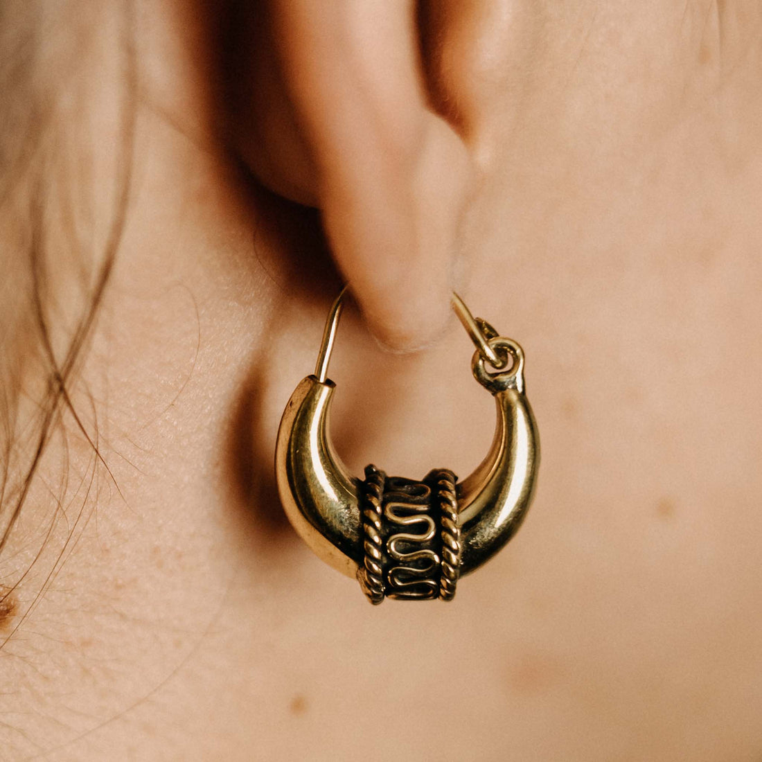 Our brass earrings are available in various shapes such as creoles, mandala or with healing stones such as rock crystal .