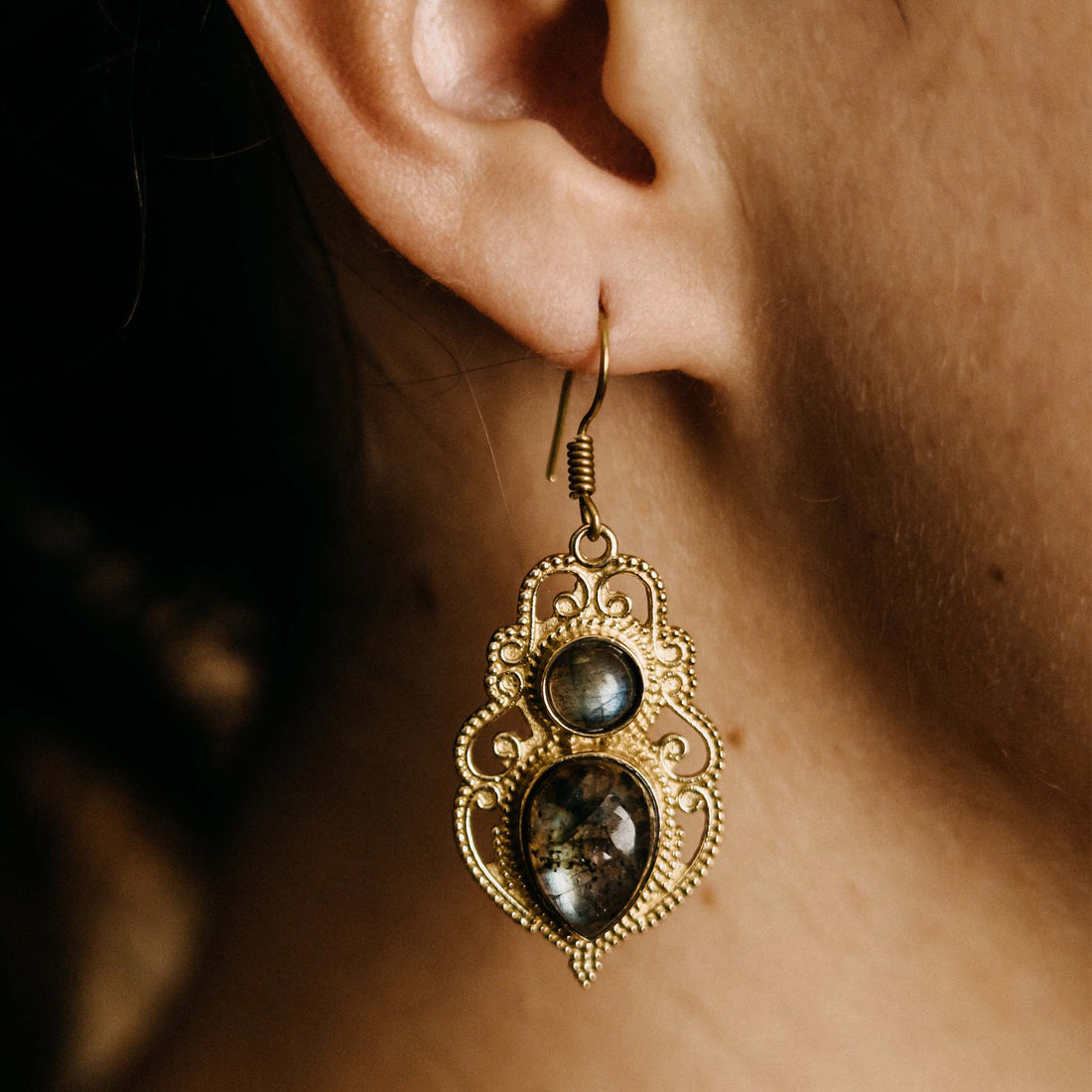 Adorn yourself with these enchanting earrings from India featuring labradorites. Choose between gold and silver....