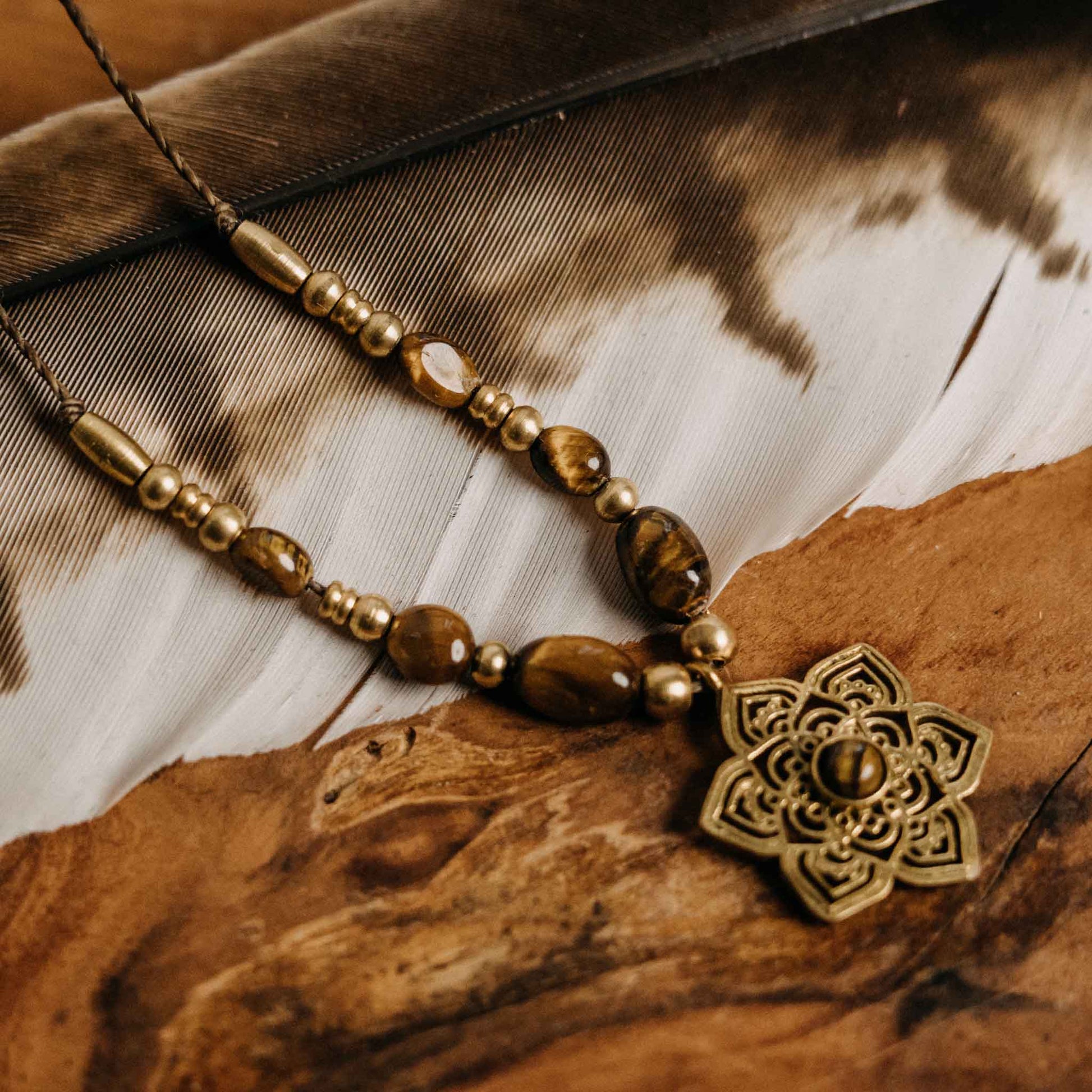 Diese Halskette sorgt für einen besonderen Hingucker mit dem Steinen aus Tigerauge und einem Mandala mit Tigerauge. Dank des verstellbaren Verschlusses kannst du sie auf verschiedenen Höhen tragen.
