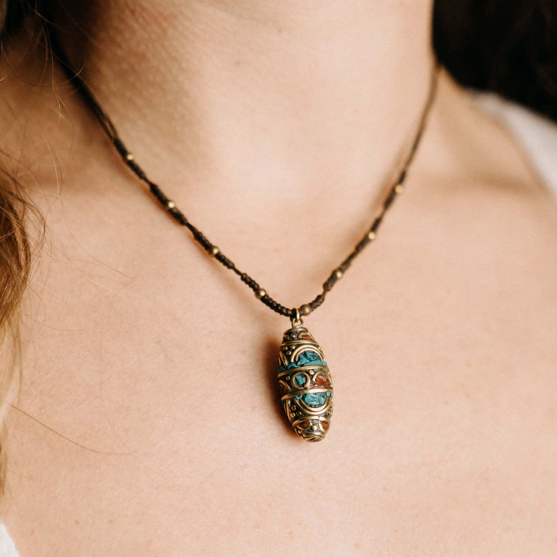 You can find our handmade boho necklaces made of wood, brass and bone in shapes such as mandala, ohm, vegvisir, buddha, hammer of Thor or hand of Fatima.