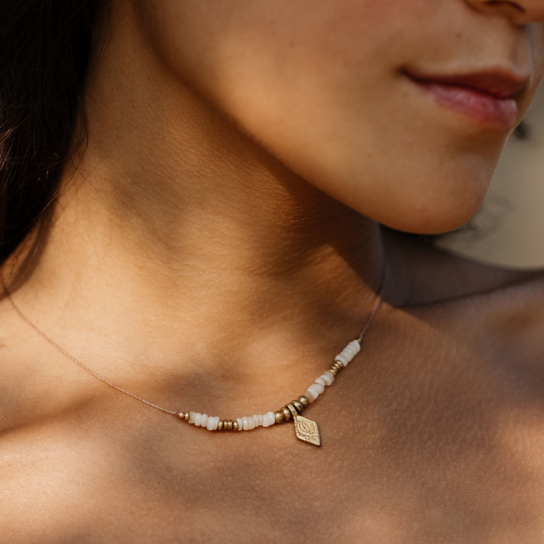 A delicate necklace with mother-of-pearl beads and brass pendants, handmade by shop owner Lisa. An...