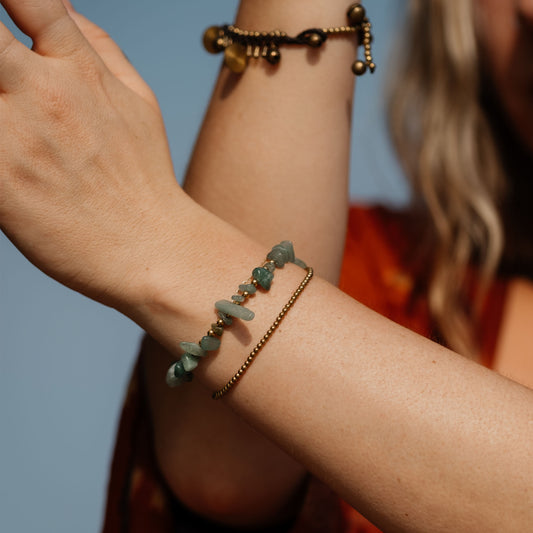 Hand-knotted bracelet with aventurine splinters. The bracelet fastens with a loop and a bell. Material:...