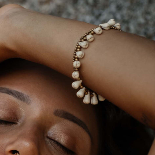 Hand-knotted bracelet with white howlite drops. The bracelet fastens with a loop and a bell....