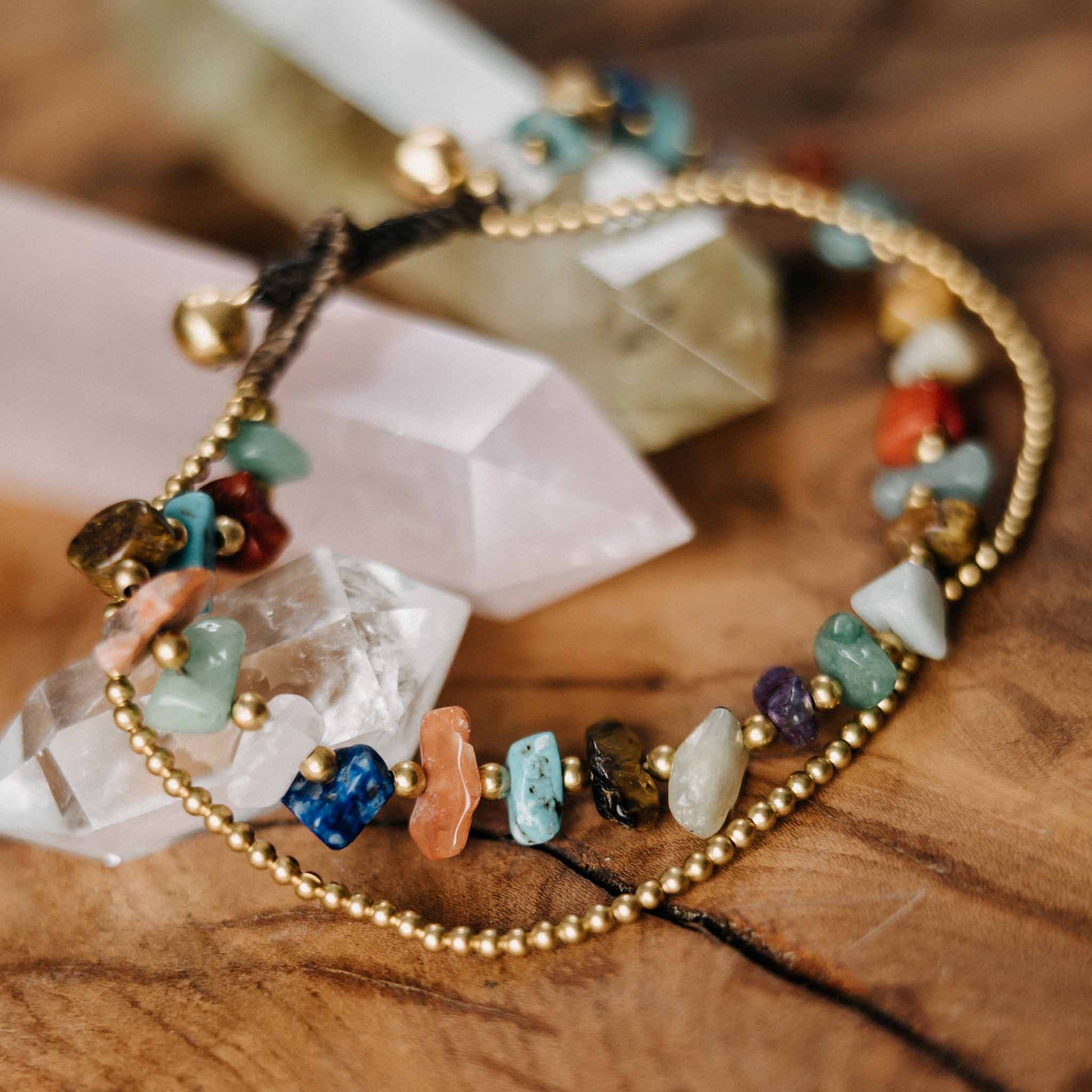 Anklet with many colorful stones. A bell is attached to the end of the chain.