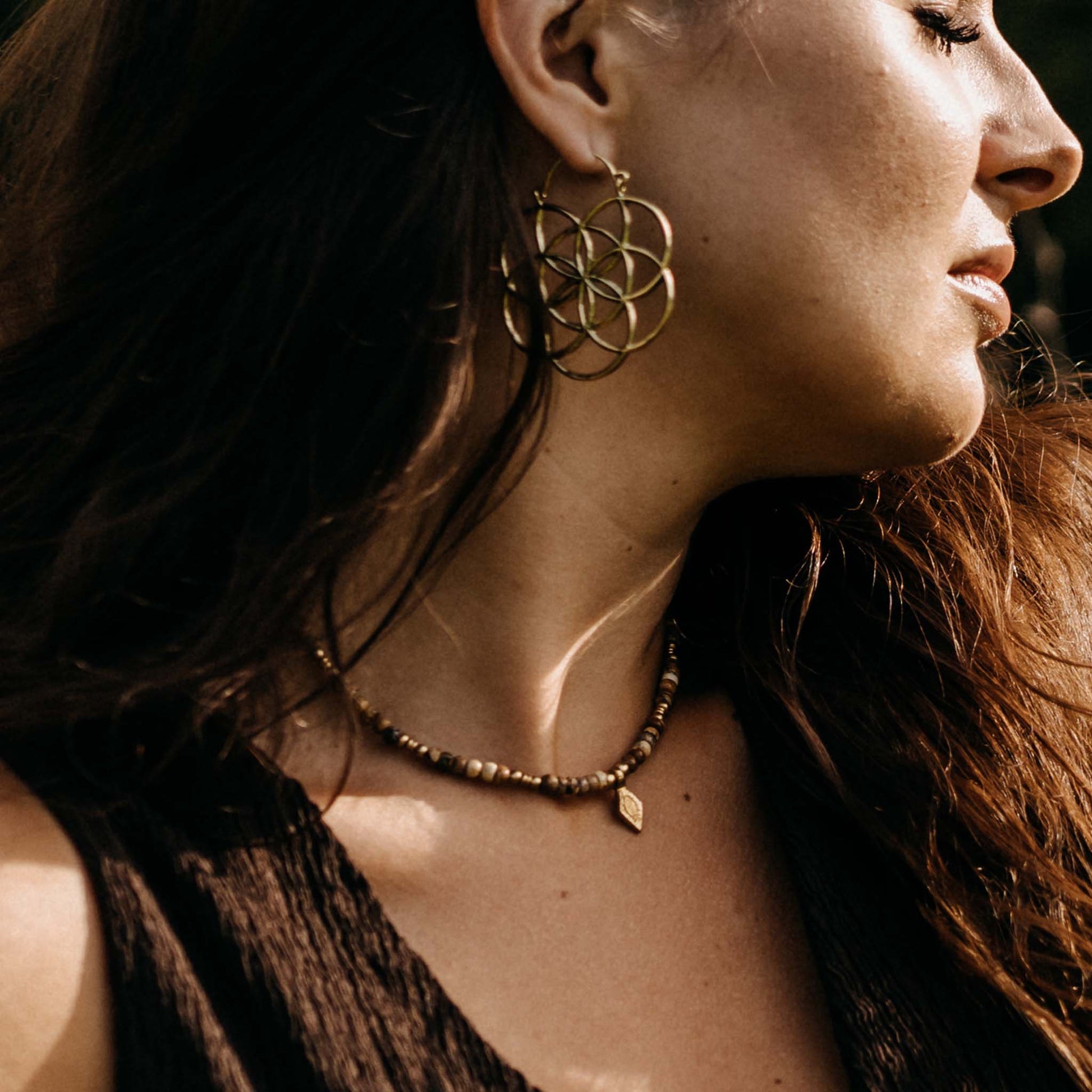 Halskette mit schmalen Jaspisperlen und einem Messinganhängern, handgemacht von der Shopinhaberin Lisa. Du kannst sie durch einen verstellbaren Verschluss auf verschiedenen Höhen anbringen, auch als Choker tragbar. Diese einzigartigen Ketten bringen eine filigrane Boho-Ästhetik mit sich und umhüllen dich mit dem Zauber von handgemachten Schmuckstücken.