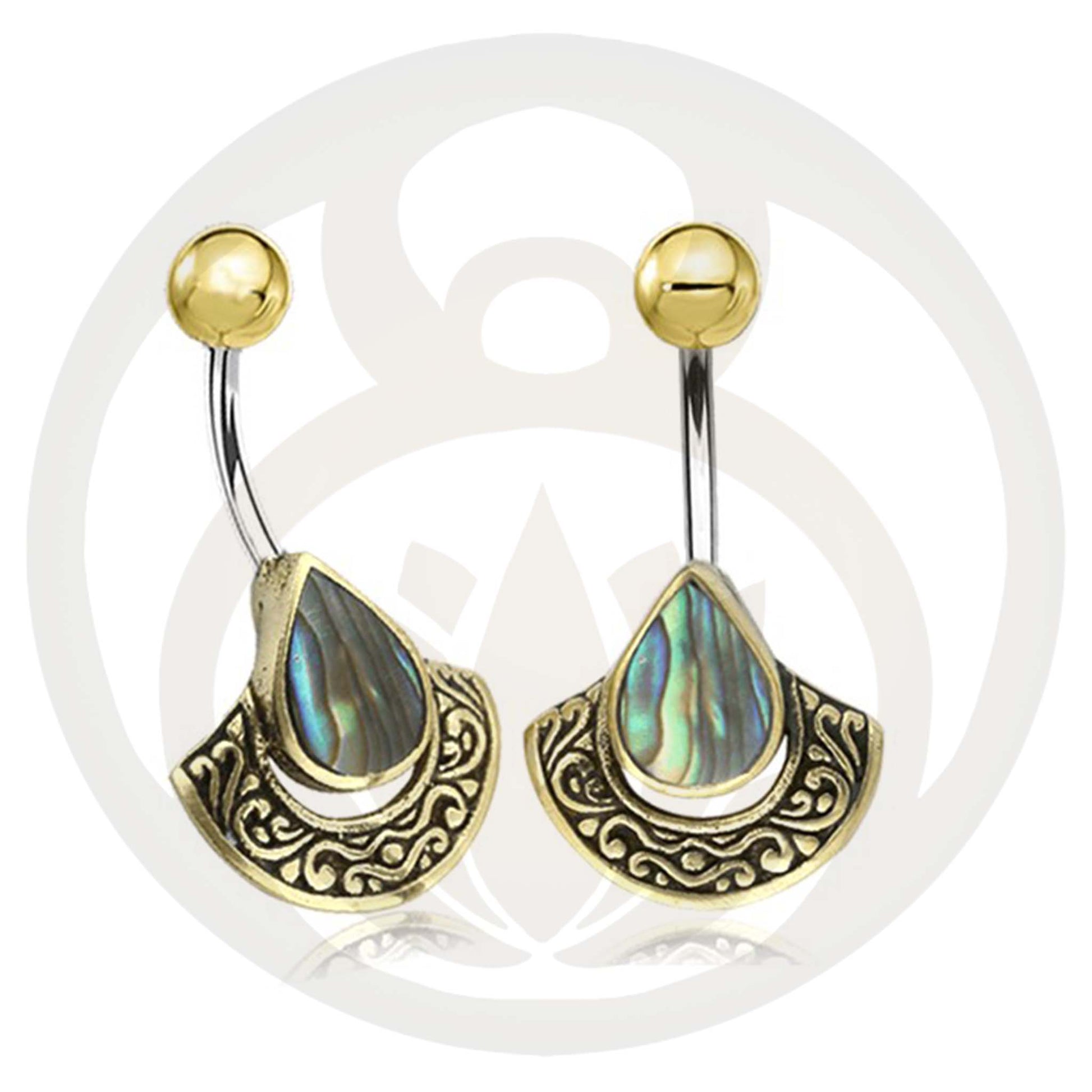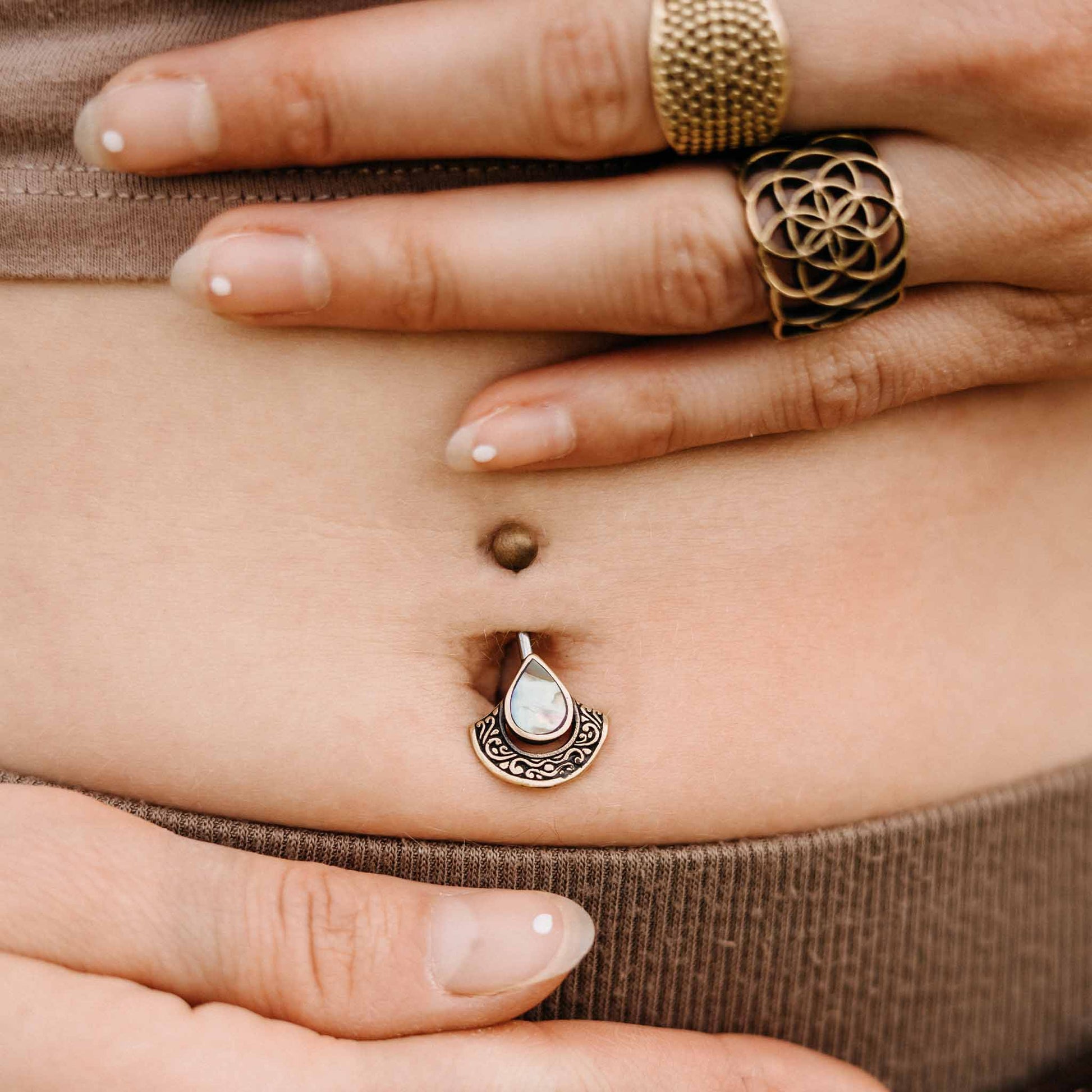 Piercing de ombligo hippie único con piedra curativa integrada. La piedra curativa en forma de gota está colocada en la mitad de un mandala que tiene un patrón celta. Con este piercing boho en el ombligo seguro que atraerás miradas mágicas. Deje que la piedra curativa de su elección lo acompañe todos los días y lo proteja en sus próximas aventuras.