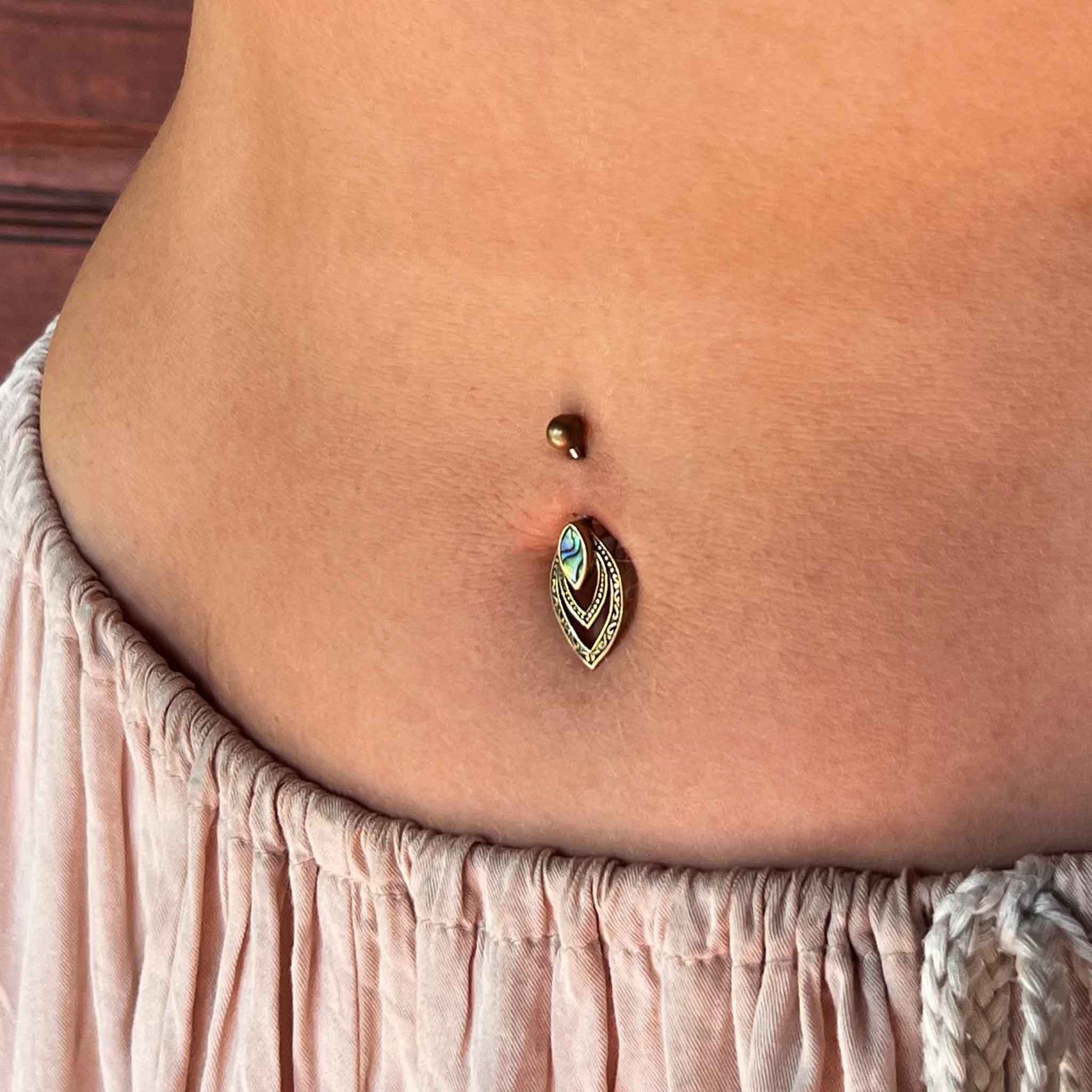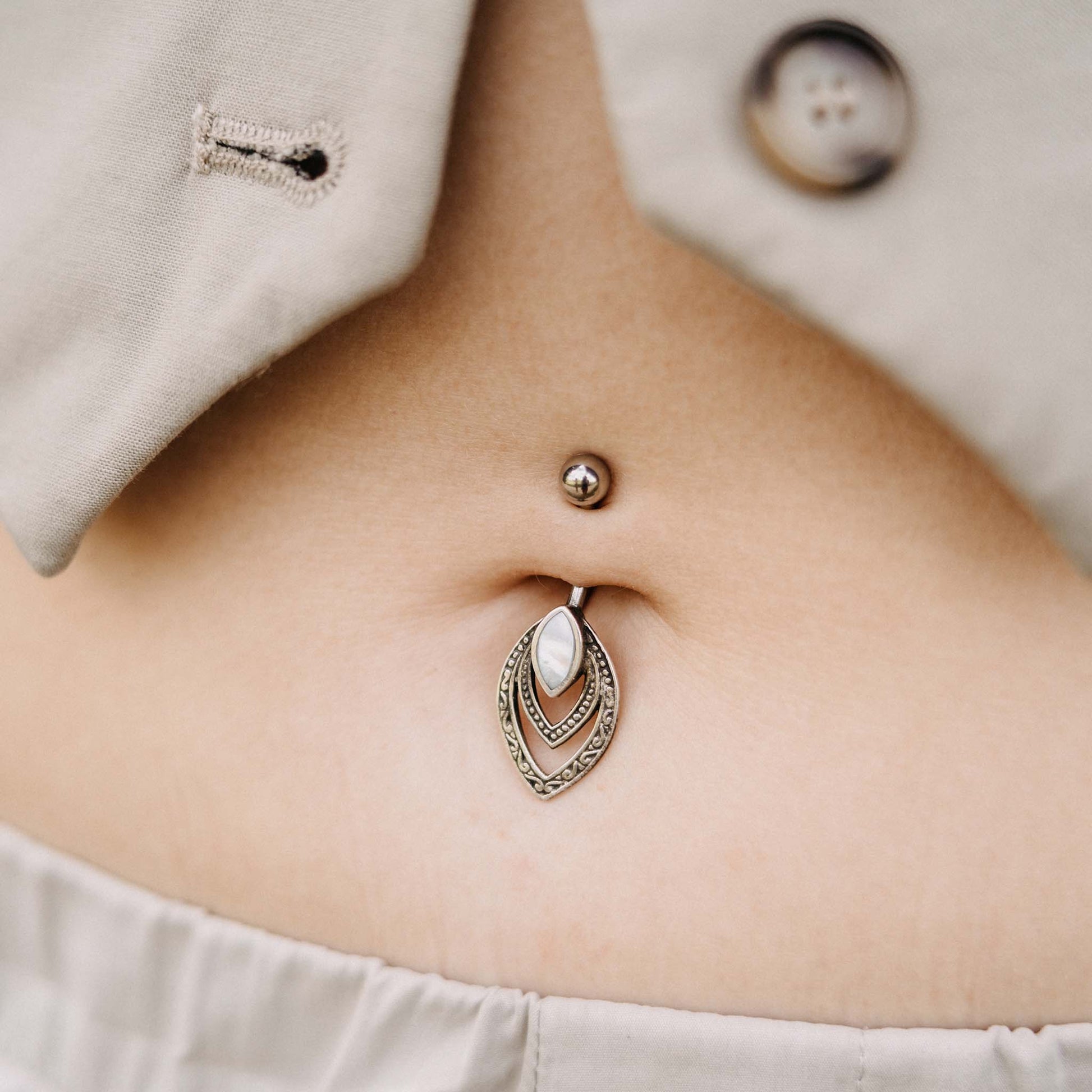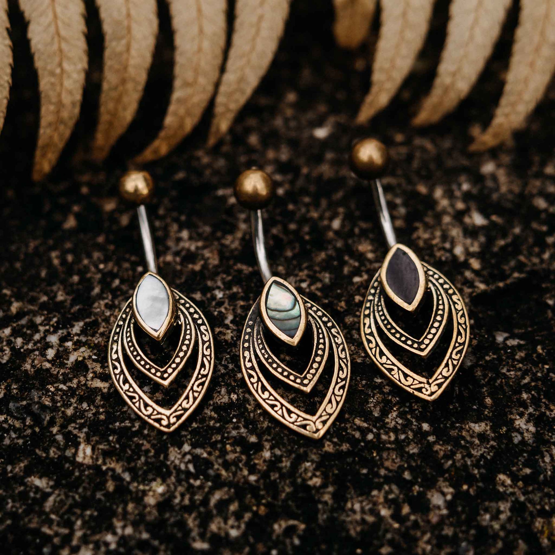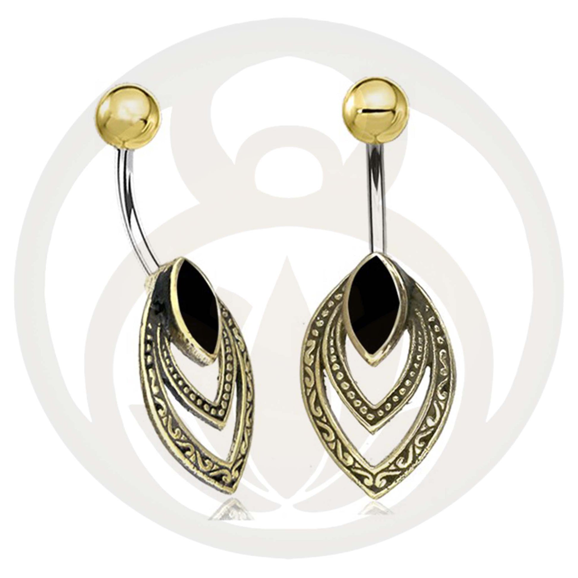 Joyas para el ombligo en filigrana con una piedra curativa en forma de lágrima, incorporada en dos finos mandalas puntiagudos con motivos celtas.