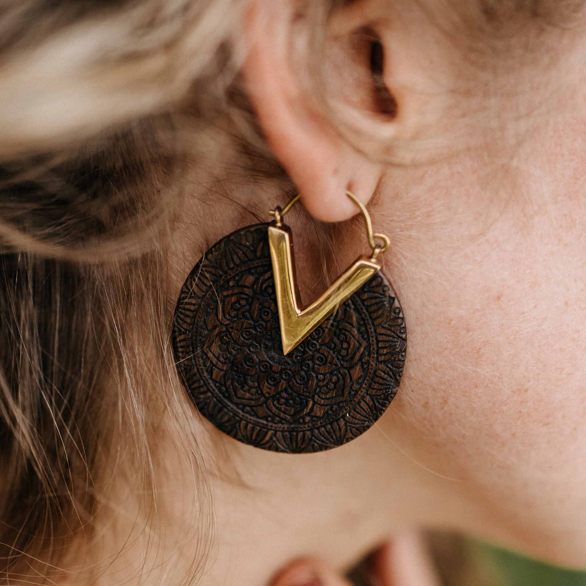 Hölzerne Ohrringe mit einem filigran gearbeiteten Mandala. Mit ihrem angenehmen Gewicht sind sie auch super im Alltag tragbar. Alle Ohrringe werden im Paar geliefert.