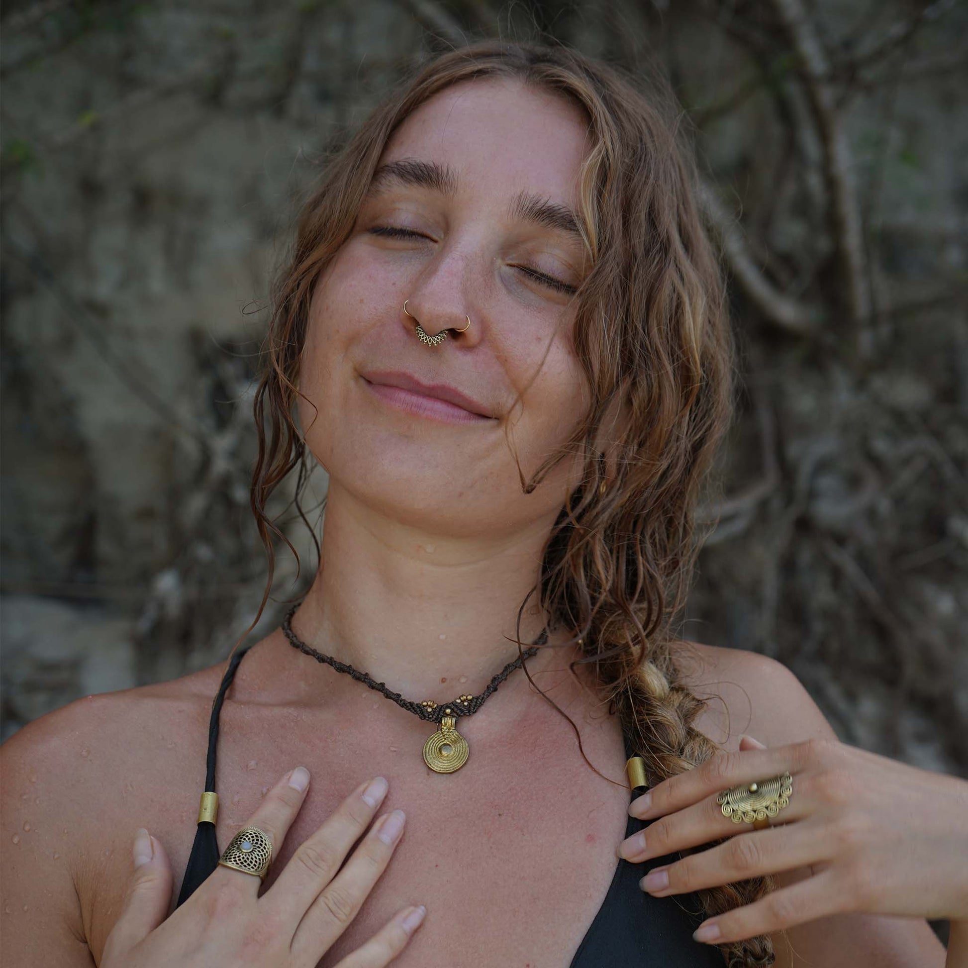 Statement Halskette mit einem großen Anhänger und goldenen Messingperlen, handgemacht von der Shopinhaberin Lisa. Du kannst sie durch einen verstellbaren Verschluss auf verschiedenen Höhen anbringen. Diese einzigartige Kette bringt Boho-Ästhetik mit sich und umhüllt dich mit dem Zauber handgemachter Schmuckstücke.