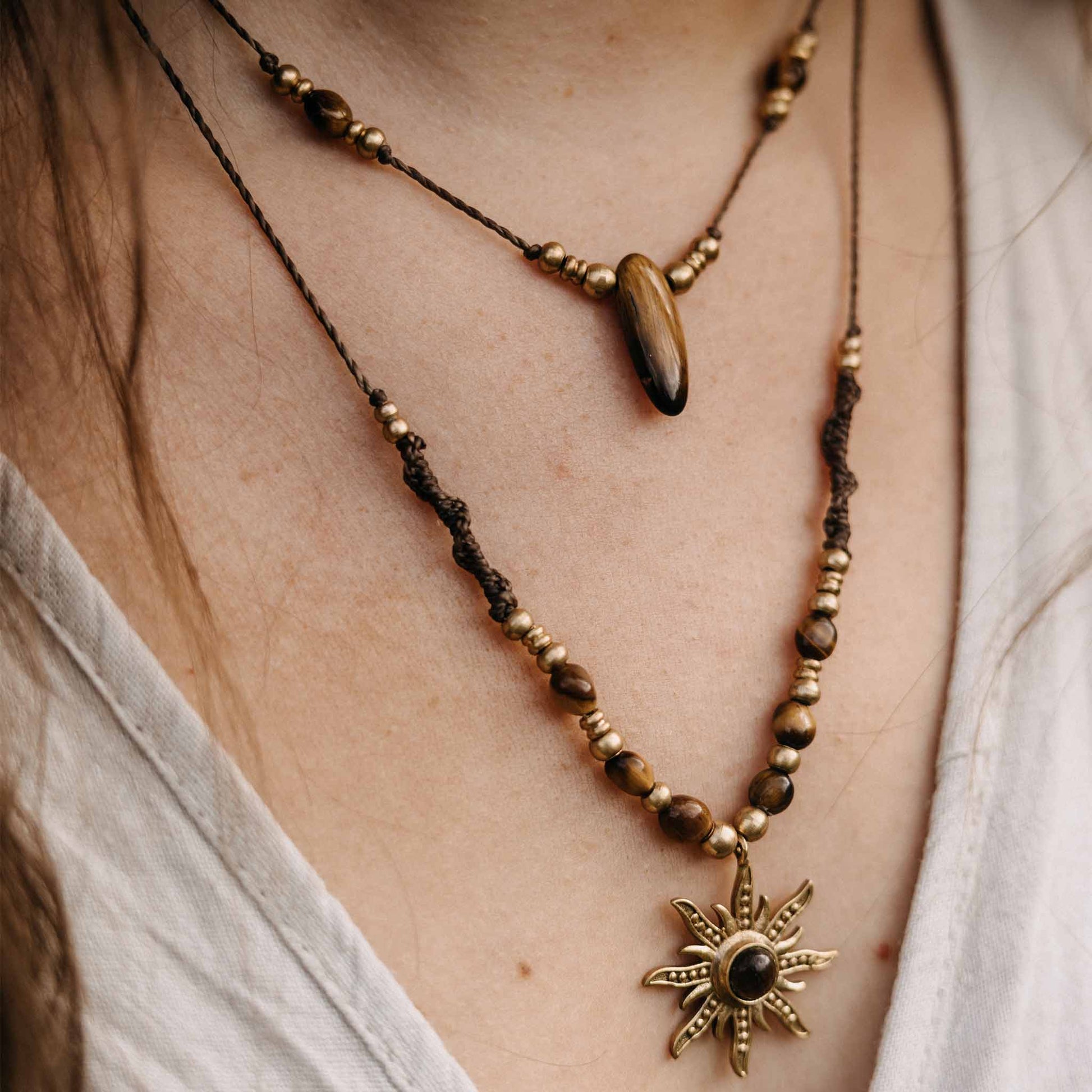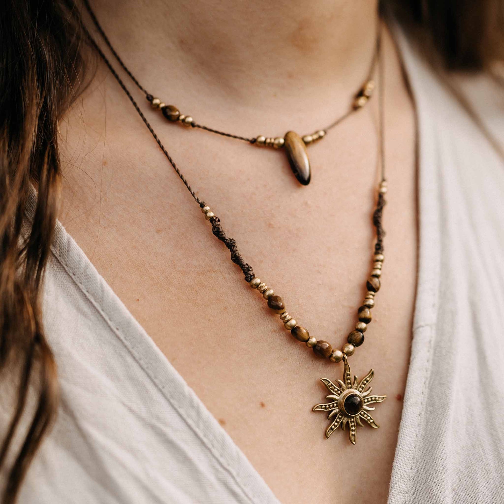 Diese Halskette besteht aus zwei einzelnen Ketten: eine feine schmale Halskette mit einem langen Tigerauge-Stein und einer größeren Halskette mit goldbraunen Tigerauge-Nuggets, einem strahlenden Sonnenanhänger und einem liebevoll geknüpften Makramee-Element.