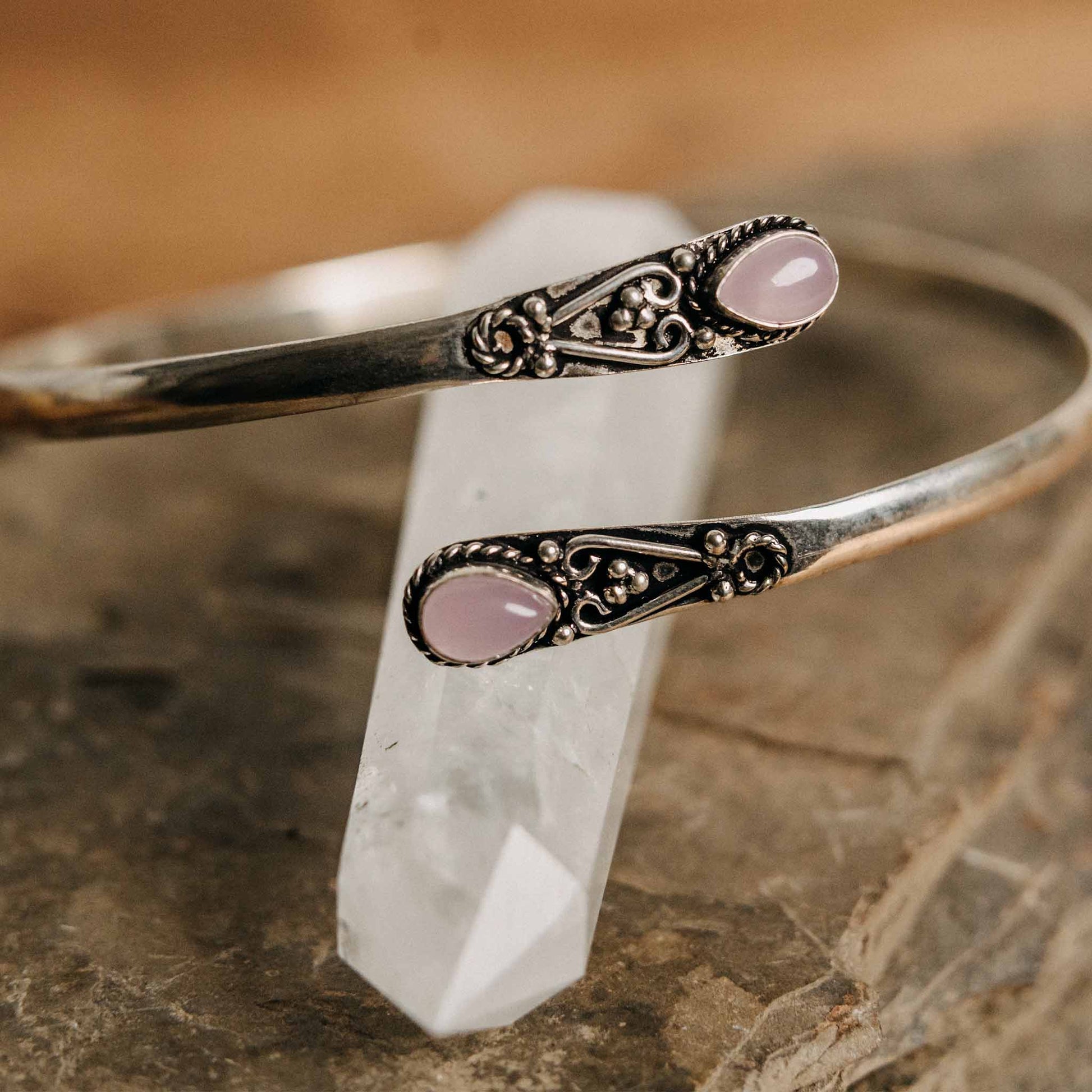 Handgemachter Oberarmreifen eingearbeitetem Rosenquarz.Du kannst dir den Armreifen individuell an deine Körperform anpassen, er lässt sich einfach in Form biegen. Auf dem Tragebild dient der silberne Armreif zur Veranschaulichung.